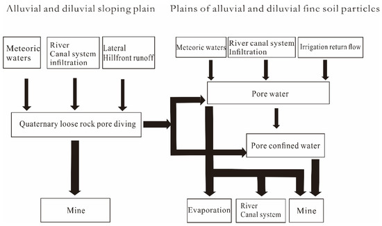 According to the hydrochemical and isotope distribution characteristics of the studied area, the confined aquifer in the alluvial–diluvial plain area received water recharging from the loose rock porous unconfined aquifer and upper porous unconfined aquifer of the Quaternary in the upper alluvial–diluvial slope plain, which was discharged through artificial and lateral downstream. The recharging and discharging relationship between units in the unconfined aquifer and confined aquifer are shown in Figure 11.