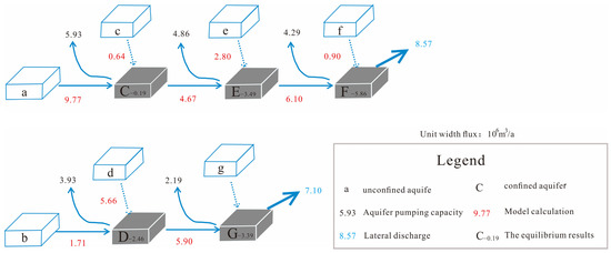 The results showed (Figure 12) that units a and b in the studied area were single-structure unconfined aquifers as the main recharge resources of the downstream confined aquifer. Unit C accepted the lateral recharge from unit a and the leakage recharge from Unit c, which were 9.77 × 106 m3/a and 0.64 × 106 m3/a, respectively. Unit E received the lateral recharge from unit C and the overflow recharge from unit e, which were 4.67 × 106 m3/a and 2.80 × 106 m3/a, respectively. The unit F received the lateral recharge from the unit E and the overflow recharge from the f unit, which were 6.10 × 106 m3/a and 0.90 × 106 m3/a, respectively. Unit D received the lateral recharge from unit b and the overflow recharge from unit d, which were 1.71 × 106 m3/a and 5.66 × 106 m3/a, respectively. The unit G received the lateral recharge from the unit D, and the recharging was 5.90 × 106 m3/a. This recharge relationship and degree were consistent with results from hydrochemistry and isotope.