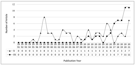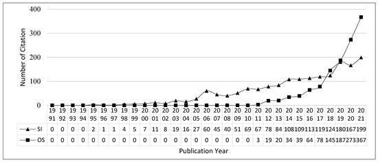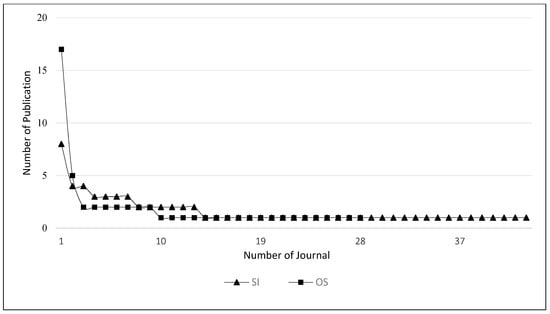 - Exploring the distribution of SI by Bradford’s law, the ratio of the number of journals in each area was in the SI research aspect, which is consistent with the Equation (1) relationship between the number of journals in each area stated by Bradford’s law, thus, the distributions of publication characteristics in the SI research domain did conform to the relationship of Bradford’s law. Additionally, utilizing Bradford’s law to examine the distribution of OS, the ratio of the number of journals in each area was , which is inconsistent with the Equation (1) relationship between the number of journals in each area stated by Bradford’s law. This reveals that the distributions of publication characteristics in the OS research domain did not correspond to Bradford’s law. According to Lotka’s law, the value of the exponent for SI was estimated at , and the constant was computed at . Applying the K–S test revealed that the maximum deviation found was which did not exceed the critical value of at the 0.01 level of significance. Therefore, a null hypothesis must be accepted, and it must be concluded that the dataset of SI did conform to Lotka’s law. Furthermore, based on Lotka’s law, the value of the exponent for OS was estimated at and the constant c was computed at . Applying the K–S test, the maximum deviation found was which did exceed the critical value of at the 0.01 level of significance. Thus, a null hypothesis must be rejected, and it must be concluded that the dataset of OS did not fit Lotka’s law. The reason why OS did not follow either Bradford’s law or Lotka’s law is that the number of authors who published only one article was too large; as a result, the difference between the observed value and the expected value was greater than the K–S test critical value. This effect reveals that the distributions of OS diverged from the slope of Lotka’s law.