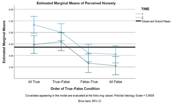 The results of a repeated measures ANOVA with political ideology as a covariate and including planned contrast run within the ANOVA show that the results are consistent with the hypothesized half-truth effect. That is, there is a significant between-subject main effect of the truth–honesty scale (F (1, 282) = 10.43, p < 0.001, η2 = 0.1), and a significant within-subject main effect of time (ratings of the original stimulus vs. the rating after seeing the de-biasing stimuli, F (1, 282) = 18.09, p < 0.001, η2 = 0.06). In addition, the paired comparisons show that the stimuli that start with a true statement (True–True and True–False) are not significantly different from each other at either time 1 or time 2 (Time 1: p = 0.221 n.s.; Time 2: p = 0.657 n.s.). Similarly, the stimuli that start with a false statement (False–True and False–False) are not significantly different from each other at either time 1 or time 2 (Time 1: p = 0.826 n.s.; Time 2: p = 0.285 n.s.). However, in the planned contrasts comparing statements beginning with a true statement to the statements beginning with a false statement, all paired contrasts are significantly different (all p’s < 0.01) (see Table 1 and Figure 4).
