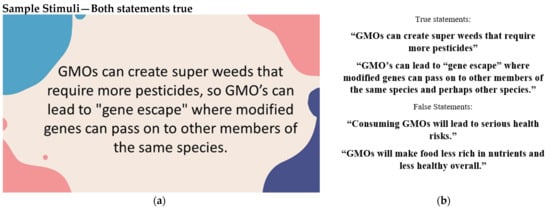 Additionally, the practical implications of this research can be employed by psychologists, public policy professionals and communications experts to formulate primary communications, as well as initiate a response to false claims being pushed on social media and elsewhere. Public perceptions of sustainability topics such as sustainable living and GMOs are fraught with misinformation. Common misconceptions view sustainable living as a practice that is only possible for high income populations and requires making lifestyle sacrifices plus adherence to strict rules [55]. Similarly, false claims on the safety of GMOs are negatively influencing individuals’ perceptions of the food source, despite the fact that scientific evidence reports no significant hazard connected to the use of genetically modified crops [59,74,75]. The present research provides a roadmap to dissect the source of the misconceptions and construct a response that is likely to undermine the belief in the false narrative in favor of factually true information. For example, by knowing that a true statement followed by a false statement will increase the belief in the false statement, policy makers will be better equipped to construct a response to misinformation that starts with a reference to what is false rather than a reference to what is true.