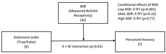 First, data from the evaluation of the original presentation of the stimulus (Time 1) were evaluated for moderation using the PROCESS version 4.0 [69] Model 1 with 5000 bootstrap samples for bias corrected 95% confidence intervals. The order of statement presentation (True–True, True–False, False–True, and False–False) served as the categorical dependent variable (X), BSR scale was the continuous moderation variable (W), the two-item truth–honesty scale was the independent variable (Y), and political ideology (PI) was included as a covariate (see Figure 6).