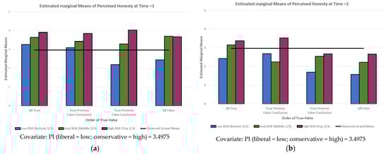 Experiment 2: GMO Stimuli—premise [therefore …] conclusion—by BSR (low, medium, high) with political ideology (PI) included as a covariate. Truth–honesty scale of the original stimuli (time 1) and after viewing the de-biasing stimuli (time 2).