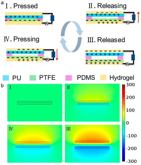 The working mechanism of FL-TENG is shown in Figure 3a, which shows the single electrical output process of FL-TENG. In this figure, polyurethane (PU) film is used as the top dielectric friction layer, polytetrafluoroethylene (PTFE) is used as the bottom dielectric friction layer, PDMS is used as the middle support layer to facilitate the contact and separation between the two friction layers of PU film and PTFE film, and the hydrogel is used as the conductive electrode. Initially, no external force is applied to FL-TENG, and the top and bottom dielectric friction layers are separated. When an external force is applied to the FL-TENG, the FL-TENG is deformed, resulting in complete contact between the polyurethane (PU) friction layer and the polytetrafluoroethylene (PTFE) friction layer, and due to the frictional electric effect, produces frictional electricity. Moreover, the polyurethane (PU) layer tends to lose electrons and the polytetrafluoroethylene (PTFE) layer tends to gain electrons easily, and electrons are transferred from the surface of the polyurethane (PU) layer to the polytetrafluoroethylene (PTFE) layer (state I). When the applied external force disappears gradually, the upper friction layer and the lower friction layers are separated, and the charge separation on the surface of the friction layer generates a potential difference, which drives the charge transfer from the electrode with the PTFE layer to the electrode with the PU layer (state II). When the applied external force disappears completely, the charge transfer ends and the electron flow stops (state III). When the FL-TENG is compressed by the force again, the upper and lower friction layers approach each other to produce a reverse internal electric field, and electrons are transferred from the electrode with the polyurethane (PU) layer to the electrode with the polytetrafluoroethylene (PTFE) layer (state IV). A cycle is completed when the upper and bottom friction layers are in full contact. Afterward, the FL-TENG is compressed and released to start a new cycle. Corresponding simulations of potential distribution in four different states by COMSOL are presented in Figure 3b. Because of its unique working mechanism and excellent outputting voltage characteristics, it can be used for monitoring various sports activities.