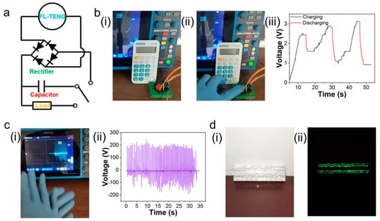 The FL-TENG can be used not only as a sensor for human motion monitoring but also as an energy harvesting device. The efficiency of the FL-TENG is further improved by collecting, converting, and storing mechanical energy as electrical energy for optional use. Figure 5a shows the power management equivalent circuit of the FL-TENG, which consists of a capacitor, a bridge, and a load. The operating state can be switched between the FL-TENG and the load, corresponding to the charging and discharging modes, respectively. As shown in Figure 5b, we attached the two friction layers of the FL-TENG to a nitrile glove and charged the commercial calculator by clapping our hands. The starting state is shown in Figure 5b(i). The charging switch was turned on after charging the capacitor for some time by continuously clapping our hands, and the commercial calculator was charged and lit up, as shown in Figure 5b(ii). Figure 5b(iii) shows the actual charging and discharging process of the commercial calculator (Supplementary Video S1). In today’s world, with a global population of over 8 billion, people are creating huge amounts of energy while demanding more of it. Human movement mechanical energy as a green and sustainable energy source provides more options to solve the energy crisis. As shown in Figure 5c, we can obtain a 241 V instantaneous voltage output by a simple clapping action (Supplementary Video S2), and Figure 5c(i,ii) show the clapping mechanical energy harvesting and output voltage, respectively. As shown in Figure 5d, we further demonstrate the feasibility of converting mechanical energy collection into electrical energy supply with the FL-TENG, where 122 LEDs are easily lit by a common clapping action (Supplementary Video S3). This makes it clear that there is a huge amount of green energy latent in people’s daily activities, which is almost ignored in daily life, thus making the mechanical energy wasted in the form of waste energy. The fabrication of FL-TENG provides a reference solution to alleviate the energy problem and collect biomechanical energy.