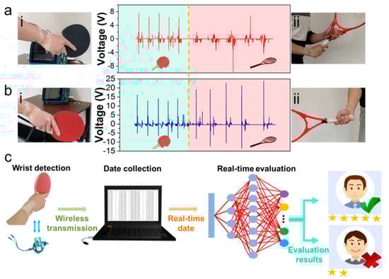Nowadays, while people are concerned about energy issues, they are also starting to focus on their physical health. To pursue a healthy lifestyle or avoid physical illness, more and more people are participating in sports such as table tennis and tennis. However, many people who are new to a sport have a poor understanding of the technique, and the lack of formal technical instruction can cause joint injuries. Some of these joint injuries are irreversible, such as triangular cartilage disc injuries caused by irregular table tennis swings, and wrist tendinitis, lumbar strain, and knee meniscus wear caused by irregular tennis swings. The occurrence of sports injuries is contrary to the original intention of pursuing health, so the judgment and correction of wrong movements are particularly important. Here, we present the design of an FL-TENG-based wireless intelligent motion correction system that combines triboelectric nano-generation technology with a wireless intelligent host signal processing and visualization system. Figure 6a shows the output voltages of the canonical table tennis attack technique and tennis swing action, where Figure 6a(i) shows the state photo of the wrist for the canonical table tennis attack technique and Figure 6a(ii) shows the state photo of the wrist for the canonical tennis swing. Figure 6b shows the output voltages for the incorrect table tennis attack technique and tennis swing action. Whereas Figure 6b(i) depicts the state of the wrist for the incorrect table tennis attack technique, Figure 6b(ii) depicts the state of the wrist for the incorrect tennis swing. By comparing the output voltages of Figure 6a,b, it can be seen that the voltage produced by the standardized technical action is significantly smaller than that produced by the incorrect action, which is consistent with the stable wrist of the standardized technical action and the wide range of wrist movement of the incorrect technical action. Figure 6c shows the working form of the FL-TENG-based wireless intelligent motion error correction system. The circuit diagram of the wireless intelligent error correction system is shown in Supplementary Figure S1. The FL-TENG is attached to the wrist, and when the ping-pong paddle is swung, the friction device detects and obtains the wrist motion data and transmits the data wirelessly through the transmitter of the error correction system to the data receiver. The host computer signal processing and visualization system processes and evaluates the collected data in real time, and displays the evaluation results (Video S4). The wireless intelligent motion error correction system will be the first to detect incorrect movements during the initial stages of learning sports skills and will assist people in correcting technical movements during the generalization stage of sports skill formation, preventing sports injuries caused by incorrect technical movements. The combination of FL-TENG and a wireless intelligent motion error correction system ensures that people’s health and safety are protected during physical activity.