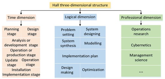In the three-dimensional structure diagram, the time dimension is the time sequence from the beginning to the end of the whole system engineering activities, which is divided into seven stages: planning, design, analysis or development, operation research or production, installation, operation and update. In each stage of the time dimension, a thinking process is required. This process is the logical dimension, which includes seven steps: problem setting, system design, modeling, optimization, decision making and implementation plan. The professional dimension lists the knowledge and skills in construction, commerce, law, management, etc., that need to be used in the implementation steps of the project. The three-dimensional structure system vividly represents the framework of system engineering research, which can be further expanded at any stage or step to form a hierarchical tree system.