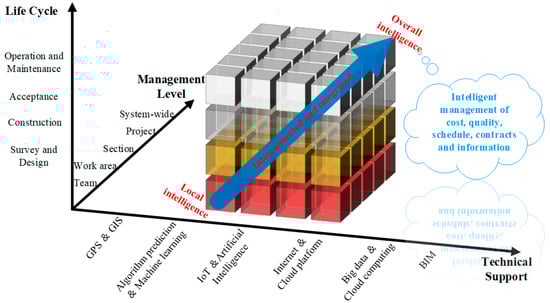 The implementation of railway intelligent construction is the need of national strategic development and the demand of society. Based on the idea of system engineering, this paper proposes a three-dimensional railway intelligent construction system architecture composed of a full life cycle, management level and technical support. Based on this architecture, a “three-step” implementation path is proposed. Then, it analyzes the technology support framework required in the architecture based on Building Information Modeling (BIM), incorporating Global Positioning System (GPS) and Geographic Information System (GIS), algorithmic prediction and machine learning technology, Internet of Things (IoT) and artificial intelligence technology, big data and cloud computing technology, and the application of railway intelligent construction system architecture is analyzed by taking a railway tunnel project in Zhejiang Province of China as an example. Finally, it discusses the problems that may be encountered in the implementation of railway intelligent construction and puts forward relevant suggestions. The results show that railway intelligent construction is an essential way. At present, China’s railway intelligent construction is still in the primary stage. The design organization should do a good job in the top-level design and accumulate sufficient data for the later stage. All parties in the middle stage of construction should do a good job in the induction and integration of information and accumulate sufficient experience. In this way, we can integrate into the advanced stage and give full play to the advantages of software and hardware integrated applications such as BIM, IoT, big data, cloud computing and intelligent devices so as to truly realize the intellectualization and modernization of railway construction.