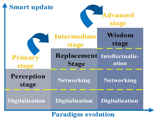 As can be seen from the system architecture constructed in the previous section, the intelligent construction system first realizes local intelligence and then gradually “empowers” more and more through interconnection and comprehensive integration, with wider coverage, more and more powerful intelligent functions, and finally realizes overall intelligence. According to the development status of railway engineering construction informatization and artificial intelligence technology and the development law of intelligent technology itself, from the perspective of continuous systematization and upgrading of intelligence (as shown in Figure 4), the development process of railway engineering intelligent construction can be divided into three stages: primary, intermediate and advanced: three steps, and finally the overall realization of railway intelligent construction.