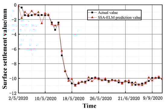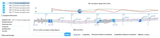 Monitoring devices such as surface strain gauges, inclinometers and acceleration sensors are deployed in the tunnel section during the construction phase, and these devices, combined with technical means such as the IoT, can transmit information to the intelligent construction platform. Figure 8 shows the monitoring map of the convergence change of the section shown by the platform. In addition, based on the surface settlement monitoring data of the tunnel in the early stage, the platform has tried to introduce machine learning to build a prediction model combining two algorithms of the sparrow search algorithm (SSA) and extreme learning machine (ELM) to predict the surface settlement caused by tunnel excavation in the later stage (Figure 9), and it can be found that the algorithm has a better prediction effect in this project. The monitoring and prediction data are used to study and judge the subsequent development trend, and the platform can automatically warn in case of data abnormality and give certain solutions for reference of the project-related personnel in conjunction with big data analysis.