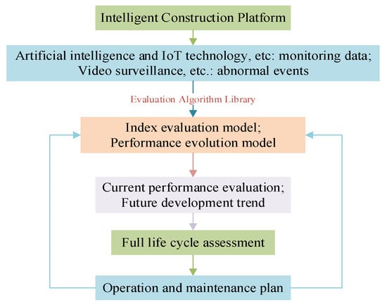 Through machine learning, artificial intelligence, IoT, Internet and other information processing technologies, monitoring data and abnormal events can be captured and implemented, and corresponding index evaluation models and performance evolution models can be formed through the built-in evaluation algorithm library of the platform (Figure 10). Carrying out implementation evaluation can further predict the future development trend and, at the same time, follow up the operation and maintenance. This cycle is repeated and followed up, forming a continuous life cycle evaluation system, and all evaluation indicators and evaluation results are presented in the model platform based on GIS and BIM.