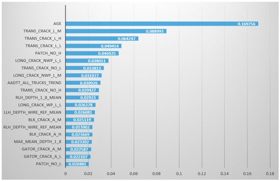 We can see from Figure 1 that road age (AGE) is the most crucial factor affecting pavement levelness, which is consistent with the concept of prediction based on deterministic models and time series and is also compatible with the findings of correlation analysis. Except for traffic volume, the rest of the characteristic critical indicators belong to pavement distresses. AADTT and AGE are all related to cumulative loads, and the road age also includes the cumulative effect from the environment.