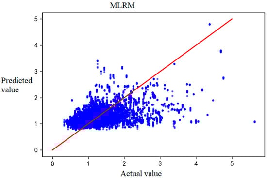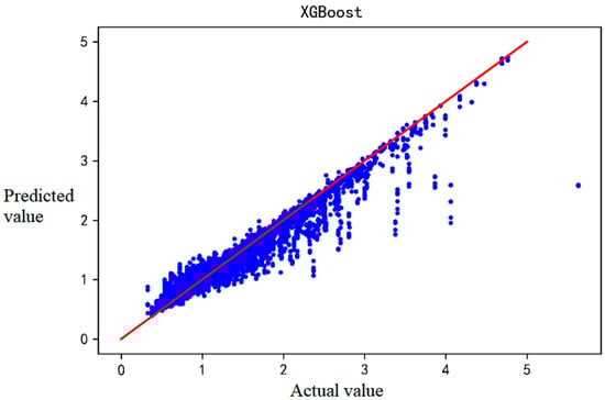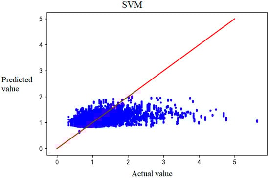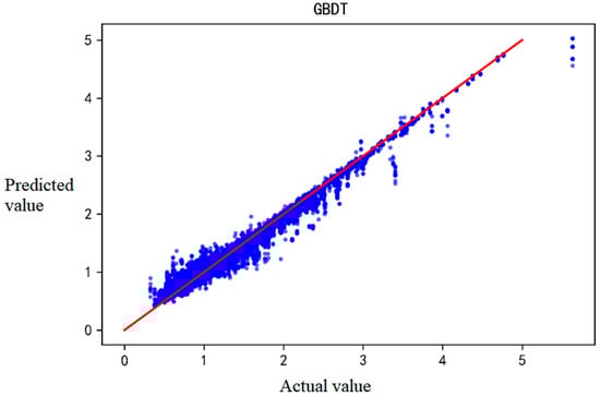 Scatter plots of the comparison between predicted and actual values of the four prediction models are in Figure 2, Figure 3, Figure 4 and Figure 5. The lines represent the exact agreement between the predicted and actual values, and the data points above the lines represent predicted values that are large relative to the actual values. In contrast, the data points below the lines represent lower predicted values than the actual ones. It is not difficult to find that GBDT and XGBoost have significantly fewer outliers away from the regression line than SVM and multiple linear regression, which indicates that the prediction effects of GBDT and XGBoost are much better than the latter two. At the same time, SVM and XGBoost are not far from reaching the fit, so the prediction effects of these two algorithms are more general under this data set.