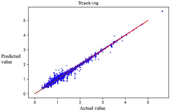 Figure 6 shows the scatter plot of the actual and predicted IRI values of the stacking fusion model, the meanings of points and lines are the same as Figure 2, Figure 3, Figure 4 and Figure 5. The stacking fusion model, based on the original GBDT and XGBoost, further approximates the regression line in the scatter plot, indicating that the overall predicted values of the fusion model are closer to the actual values in the prediction process. The fusion model obtained more minor errors and performed better, especially for larger values of IRI, and may be usable for project-level forecasting.