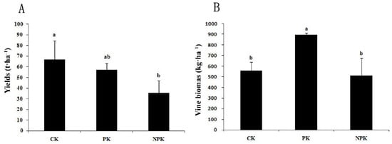 Fruit yield was lower in treatments of PK and NPK than in CK. Fruit yield was 66.7, 57.0, and 35.5 t ha−1 in CK, PK, and NPK, respectively (Figure 1A). Vine biomass was 557.9, 898.4, and 512.1 kg ha−1 in CK, PK, and NPK, respectively (Figure 1B).
