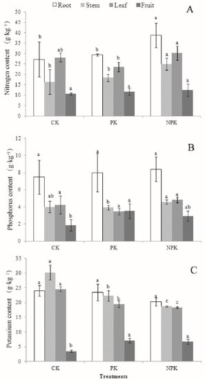 Total N (A), P (B) and K (C) content in root, stem, leaf and fruit of watermelon plants under different treatments (CK: no fertilizer, PK: no nitrogen fertilizer, NPK: chemical fertilizer. The same below). Means in each column followed by the same letter within different treatments were not significantly different at p < 0.05.