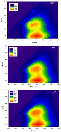 These fluorescence EEM peaks in organic substances were previously identified [,,,]. Peak A was attributable to humic-like substances, whereas Peak B belonged to fulvic-like substances []. The CK treatment contained the highest quantity of humic- and fulvic-like substances among the three treatments. In contrast, the NPK treatment contained the lowest quantity of humic- and fulvic-like substances.