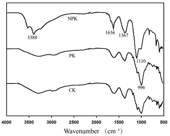 The spectra were analyzed to verify the changes introduced by different fertilizers. The absorption bands in Figure 4 include (i) H bond of OH group at 3388 cm−1, (ii) alkene C = C and H bond of C-O at 1636 cm−1, (iii) nitrate N-O stretching at 1367 cm−1, (iv) C-O stretch of polysaccharides at 1110 cm−1 and (v) Si-O at 996 cm−1 [,,,]. The increased peak at 3388 cm−1 in NPK treatments indicated the increasing development of hydroxyl structure. A sharp peak observed at 1110 cm−1 in the NPK treatment, which was not observed in CK and PK treatments, suggested the presence of non-decomposed and unstable polysaccharides in substrates of NPK treatment. Furthermore, the increased peak at 1367 cm−1 in NPK treatments compared with CK and PK treatments indicated an increasing occurrence of nitrate in NPK treatment.