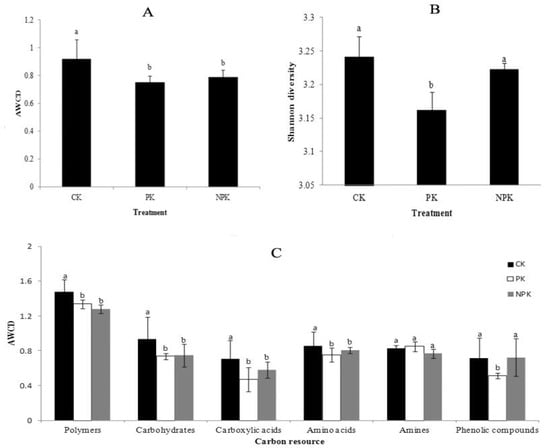 Average well-color development (AWCD) of metabolized substrates in Biolog EcoPlate (A), Shannon diversity (B) and AWCD for a functional group of carbon sources (C) under different treatments. Means in each column followed by the same letter within different treatments were not significantly different at p < 0.05.