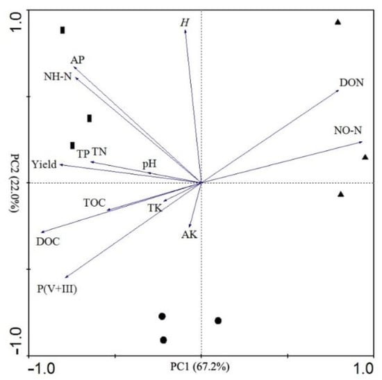 The PCA results showed that 66.9% of the data variability was explained by two principal components (i.e., PC1 and PC2). PC1 accounted for 67.2% and PC2 22.0% of the variability (Figure 6). PCA also showed that the fruit yield of watermelon correlated with the concentration of NO3−-N and DON negatively and with other chemical properties and microbial functional diversity (H) positively.