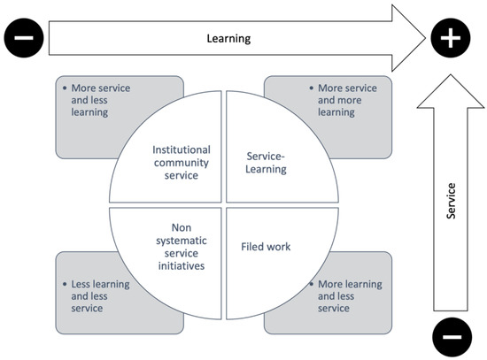 There are many environmental education initiatives that focus on raising the awareness of pupils about environmental issues, but they are limited to the level of commitment, as awareness-raising actions that do not lead to real participation. To clearly recognise the relationship between SL and other experiential practices, Stanford University created SL programmes [19]. An adaptation of this initiative is shown in Figure 1, and is a widely used tool in the academic bibliography to differentiate SL from other experiential practices (volunteering, field work, etc.), with which it is often confused [20], and to identify which aspects need to be introduced to consider these activities as SL actions.