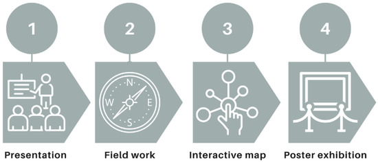 Phases of the project carried out following the SL methodology. Phase 1: Presentation of the project and the SL project; Phase 2: Students’ field work about Sustainable Development Goals (SDGs) and the historical town; Phase 3: Students put together all the information and build the service learning goal; and Phase 4: Final discussion and results presentation.