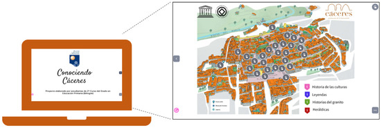 Third phase: Following this reflection, in working groups, an interactive map of the old city of Cáceres was created with the help of the Cáceres Historical City Consortium and the City Hall (see Figure 3), which was subsequently disseminated with the aim of raising awareness and valuing our heritage, in order to prevent possible actions that could threaten its conservation. With this activity, students continued working with the same groups, and each of them made a series of videos that were later uploaded to a platform so that the rest of the classmates could watch them. With the information that each group presented in their videos, a small test was carried out to evaluate the knowledge acquired throughout the project. In addition, once the interactive map was assembled, it was disseminated through social networks and among different entities in Cáceres to raise awareness of the heritage value of the old city of Cáceres.