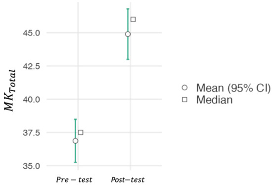 Firstly, before the analysis of the project results, the level of knowledge of the participants in relation to the use of innovative teaching methodologies in general and of SL was analysed. Since the internal reliability of the instrument could be considered as acceptable, a global score for the MK scale was calculated from the second section of the instrument as a summatory of the scores of all individual items of this section of the instrument (). Figure 4 represents the total score before and after the development and implementation of the SL project with the students. As can be seen, a substantial increase was found after implementing the SL project. In fact, the mean value of MKTotal after completing the project was 44.9 (std dev = 5.97), whereas the mean value of before completing the project was 36.9 (std dev = 5.60). A Student’s t-test showed that the difference among both values was significant (t(82) = 6.35, p < 0.001, d = 1.34), suggesting that the implementation of the SL project made a genuine difference in the students’ knowledge about active learning methodologies and SL methodology. In addition, the Effect Size (d = 1.34) denotes a very high effect.