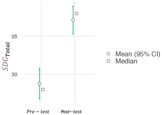 Total score for the participants’ SDG knowledge before (pre-test) and after (post-test) the implementation of the SL project.