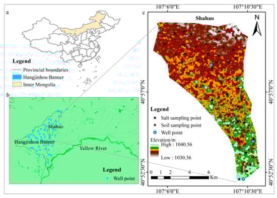Shahao (107°05′–107°10′ E, 40°52′–41°00′ N) is located in Northern Inner Mongolia (Figure 1), and occupies an area of 52.4 km2. The area is located in an arid zone with a temperate arid climate. The average annual temperature is 7.9 °C, the average annual sunlight time is 3200 h, the average annual precipitation is 136.5 mm and the average annual evaporation is 2306.5 mm. The summers are hot and dry, and the winters are cold with little snow. The main winds are western and northwestern, and the annual average wind speed is ca. 2.7 m/s. Soil freezing begins in middle or late November, the soil is frozen to a depth of 1–1.3 m, all of the frozen layers thaw in mid-May and the time between freezing and thawing is 180 days [27]. Groundwater movement is dominantly vertical, with the main sources being the penetration of field irrigation and channel leakage. The main means of groundwater consumption is evaporation, mainly by vertical movement. The groundwater depth is shallow, and the annual average groundwater depth is 1.66 m. The soil is partly non-salt and partly salted. The main crops are wheat, maize and sunflowers, and there are four to seven rounds of irrigation per year.