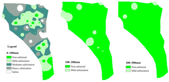 In the salinization map (Figure 5), the surface soil layer (0–100 mm depth) was the most saline [33], and the distribution of salinity was the most complex. The area statistics tool of ArcGIS was used to calculate the proportion and area of different salinization grades in this layer of soil: 28.6% of the surface layer was heavily salinized. The crop emergence rate of heavily salinized cropland was only 30–50%, and almost no grass grew on the saline soil, which could not be cultivated without irrigation or improvement. Approximately 33.6% of the land was affected by moderate salinization; in these areas, the crop emergence rate was relatively low, approximately 50–80%. This salinization is an important reason why irrigation should be conducted before farming. Salt in the surface soil was moved into the deep soil or groundwater through leaching by irrigation, reducing the salt content at the surface and improving the emergence and survival rates of planted crops.