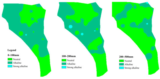 In the alkalinity map (Figure 6), the alkalinity distribution is consistent among the three soil layers. The area of strongly alkaline soil was very small, less than 1% of the total land area. Alkaline soils were widespread in the surface-to-middle soil, accounting for 55.2–62.5% of the total land area. Deeper soils were less alkaline, with alkaline soils accounting for 26.1% of the total land area in this depth range. The main crops in this region, wheat, maize and sunflower (Figure 3b), had a suitable pH range of 6.5–7.5, i.e., neutral to slightly alkaline soils. Soil that does not meet the pH requirement limits crop growth and must be improved.