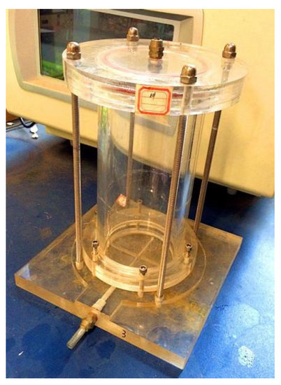Figure 2 presents a photograph of the clay model set up in a model cylinder. The model cylinder, including a top cover and a bottom pedestal, was made of polymethyl methacrylate. The inner diameter, wall thickness, and height of the model cylinder were 10 cm, 1 cm, and 25 cm, respectively. Both the top cover and bottom pedestal can be detached from the model cylinder. When they are set up, a rubber washer was used for sealing at their connections to the cylinder. A shallow, cross-shaped slot was produced on the pedestal, and effluent holes were created at the ends of the slot. A hole was also created at the center of the top cover and connected to a Mariotte bottle that was used to maintain a constant hydraulic head.