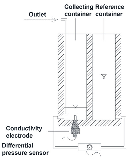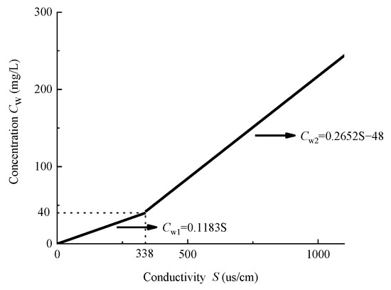 As the centrifuge modeling tests were performed under a high-speed rotation condition, an effluent collection device was developed to automatically monitor the flux and concentration of effluent from the model’s bottom, as shown in Figure 3. The collection device consisted of a pair of twin cylinders that were made of acrylic and both were opened on the top. One of the cylinders was connected to the pedestal of the model cylinder for collecting effluent, and the other was partially filled with a constant head of water acted as a reference cylinder. The twin cylinders were connected to a high-solution differential pressure transducer through the holes produced on the sidewall near the bottom of each cylinder. During the test, the change of hydraulic pressure between the effluent collection cylinder and the reference cylinder was recorded by the differential pressure transducer. The effluent volume and flux could be calculated according to the recorded data and inner diameter of the twin cylinders. An electrical conductivity sensor was installed at the bottom of the effluent collection cylinder to measure the concentration of the accumulated effluent. Both the differential pressure transducer and the electrical conductivity sensor were calibrated in advance. A mathematical analysis was provided to calculate the relationship between concentration (CW) and conductivity (S): CW < 40, CW = 0.1183S and CW ≥ 40, CW = 0.2652S − 48 (see Figure 4).