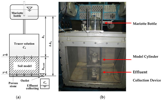 where Ce is generally defined as the effluent concentration [21,22,23]; its detailed expression was calculated by using the common Ogata solution, which is obtained by substituting Equation (5) into Equation (6). Therefore, the expression of the effluent concentration at the bottom of the soil column test is as follows.