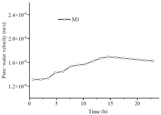 Before the centrifugal test, the permeability coefficient of the model can be measured by leaching the model. After the centrifugal model test, the permeability coefficient of the model can also be obtained according to the reduced water volume of the Mariotte bottle, the effluent volume of the collection cylinder, and the differential pressure sensor. The centrifuge modeling test was conducted at 11 °C at the beginning and 15 °C one hour later. The room temperature in the centrifuge chamber was stable at 19.6 °C, and the temperature correction coefficient of permeability coefficient was 1.012. The permeability coefficient can be calculated from the velocity. Figure 7 shows the real-time velocity obtained by the differential pressure sensor during the centrifuge test. The centrifugal model is consolidated under high osmotic pressure, and there was unstable seepage flow in the model in the meantime, which had influence on the pollution transport and pore-water velocity [20]. Therefore, the pore-water’s velocity increased with time. After a period of maximum centrifugal acceleration, the model was no longer consolidated and the pore-water velocity was steady almost. The pore water velocity fluctuated slightly in the later stage of centrifugal model test. It may be influenced by temperature rising during centrifugation. The permeability coefficients obtained in different stages and approaches are shown in Table 3. It can be found that the average of permeability coefficients obtained by the three methods in the centrifugal test is 0.935 × 10−9 m/s, which decreased by 1.6% than the penetration coefficient determined before the test. In the centrifugal test, the permeability coefficients obtained by the three methods are also slightly different, with an error rate of less than 3% relative to the mean. It can be seen that the permeability coefficient of the model remains basically stable on the whole. On the other hand, it showed that the differential pressure sensor can effectively monitor real-time velocity at the bottom of the model. The average of permeability coefficients in centrifugal test is used in the analysis.