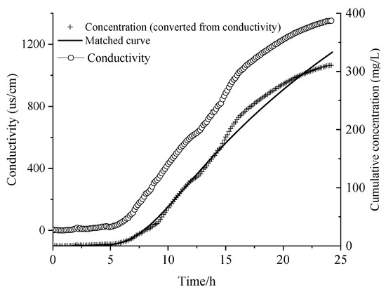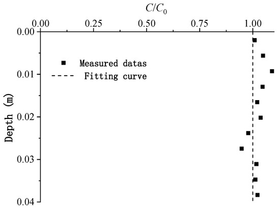 In the transport process, the pore velocities of the models were measured values, and the adsorption of chloride ion was not considered: Rd = 1. Therefore, only one parameter (the hydrodynamic dispersion coefficient, Dh) needed to be fitted based on the concentration curve. In general, according to Equation (5), the concentration profile points obtained in the test can be fitted, and the hydrodynamic dispersion coefficient Dh can be obtained. However, the model is completely broken through, and the theoretical concentration profile should be a vertical line. Thus, Dh cannot be obtained through profile fitting, and the conductivity curve of the accumulated effluent obtained in the test should be used. According to the relationship between calibrated conductivity and concentration, the conductivity curve can be transformed into a cumulative concentration curve and effluent concentration (7). The theoretical accumulative concentration curve can be acquired, so Dh = 2.065 × 10−9 m2/s can be fitted (see Table 4). The fitting curve was shown in Figure 8. The measured curve was identical with the theoretical curve. The final total accumulated chloride ion mass in the collection cylinder obtained through theoretical calculation was 446 mg, which basically coincided with the measured value (447.186 mg). The corresponding theoretical concentration profile was shown in Figure 9, which was indeed a vertical line and coincided with the measured data points. It showed that the curve of cumulative concentration measured coincided with the profile concentration data, and the test data were valid. The electrode can effectively monitor the cumulative conductivity of the outflow under centrifugal state.