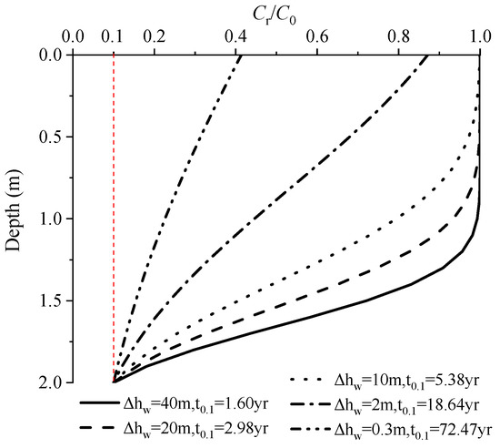 As the 2 m thick compacted clay liner with permeability coefficient of 1 × 10−9 m/s is required in the Chinese technical specifications for landfills [24,25,26], the performances of this compacted clay liner were analyzed at different hydraulic heads. The effective molecular diffusion coefficient Dd* can be taken as 6.88 × 10−9 m2/s [27]. According to the fitted Dh, α can calculated as 0.00095. According to the on-site investigation, the hydraulic head of landfill in China is high, which can reach a few tens of meters [28,29], while the landfill specifications require that the height of the hydraulic head on the liner should not exceed 30 m [25]. Therefore, in the analyses, the hydraulic head differences between the upstream and the downstream of clay liner were considered in several cases: 40 m, 20 m, 10 m, 2 m, and 0.3 m. The relative breakthrough time can be defined when the effluent concentration reaches the threshold value [30,31,32,33]. Ten percent of the source concentration was defined as the threshold value in this paper [33], and time can be expressed as t0.1. According to the calculation results (see Figure 10), under the hydraulic heads of 40 m, 20 m, 10 m, 2 m, and 0.3 m, the pollutants broke through the 2 m thick clay liner in about 1.6 years, 2.98 years, 5.38 years, 18.64 years, and 72.47 years, respectively. Therefore, under a high hydraulic head, the leachate in the landfill is easy to break through in the liner; when the hydraulic head was 0.3 m, meeting the specification, the liner can prevent the pollutant from the well.
