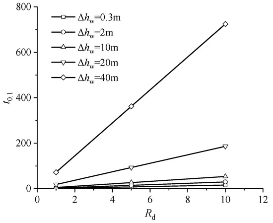 Chloride ion was chosen as the target pollutant in this study. The actual breakthrough time should be longer for strong adsorptive ions such as heavy metals [34]. According to the value of common retardation factor Rd of pollutants in clay, t0.1 of three pollutants with different adsorption in liner with different Δhw was simulated below.