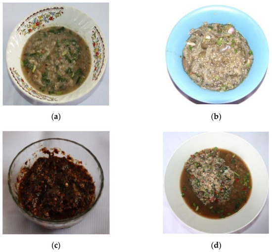 - Mopoung, R.; Thongfak, K.; Somran, S.; Boonphong, S.; Singkong, W. Factors affecting the storage of krathon sauce. NU Int. J. Sci. 2009, 6, 56–63. [Google Scholar]