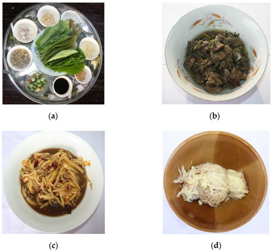 | 5. Spicy salad | Fish; Scallop; Clam; Snail; Chicken | Broken bone fruit; Bamboo (Thyrsostachys siamensis) shoot; Mushroom; Water silk (Spirogyra); Banana blossom; Round Thai eggplant; Hermit’s waterlily (Limnocharis flava) |