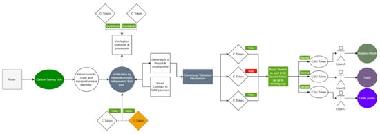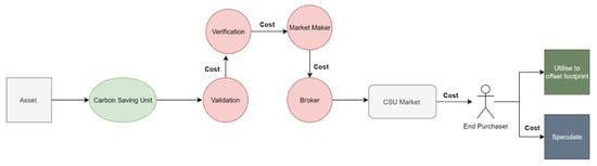 The carbon saving ecosystem has two aims, to reduce emissions and stimulate the adoption and investment of carbon saving technology and assets []. The decentralised, blockchain-enabled process allows all ecosystem participants to securely become economic stakeholders of CSU generating assets prior to them generating a CSU yield with minimal transactional costs, which will help achieve the second goal effectively. In doing so, new CSU generating assets will be more effectively and efficiently developed, helping the world reach its global climate targets faster and more efficiently.