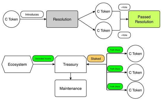 The ecosystem would operate through a native consensus token used to introduce and vote on resolutions and participate in the validation process. As the supply of these tokens is limited, each would represent a fraction of the network that can never be diluted. Users would also be incentivised to buy and hold the consensus token through a staking feature, whereby holders would be allocated their share of the profits of the ecosystem, denominated in the ecosystem CSU backed token. As more tokens are staked, the reward will decrease until it reaches the base reward per token. This would thus allow participants to enjoy a yield of CSU by making a one-time investment. Users could also lend out their consensus tokens within this conceptual ecosystem and earn a profit from it. This token would underly the network and create a much-needed economic barrier to participating in decision-making and aligning the economic interests of voters (via the price performance of their consensus tokens) with the success of the network (if the network passes resolutions that are damning, voters will theoretically lose money as their consensus tokens would be worthless), thereby ensuring the legitimacy of the process (Figure 2).