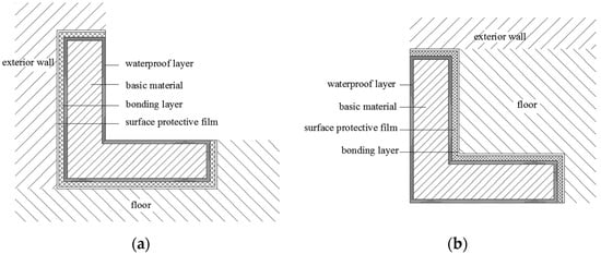 The structure and location of the building thermal bridge insulation component are shown in Figure 1: The component is a right-angle component placed at the junction of the floor and the external wall, and plays a role in local heat preservation and insulation. It can be applied both internally and externally. Figure 2 shows the structural composition of the component; it is divided into three layers: the bonding layer, the waterproof layer, and the base material. In addition, there is a surface protective film which is removed during the actual construction process.