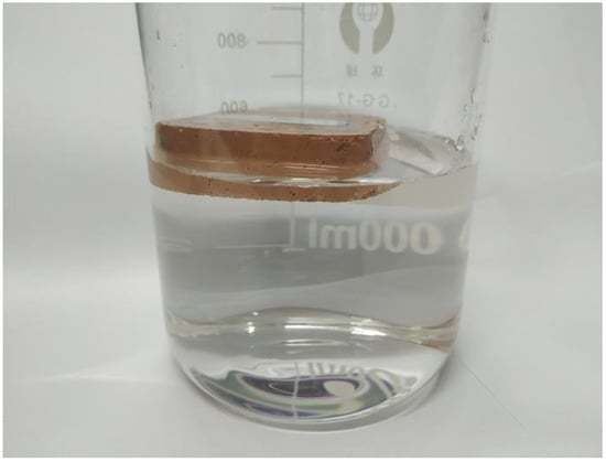 The water absorption rate of the sample with applied waterproof coating was measured. The process included three steps, as follows: Step 1: the sample coated with waterproofing agent was placed in a drying oven at 105 °C for 4 h and the dry mass of the sample was weighed; Step 2: the sample was immersed in a beaker filled with water and left standing; Step 3: the sample was removed after 72 h, the surface moisture wiped away, and the mass of the sample after it had absorbed water was immediately weighed []. The calculation formula for water absorption is