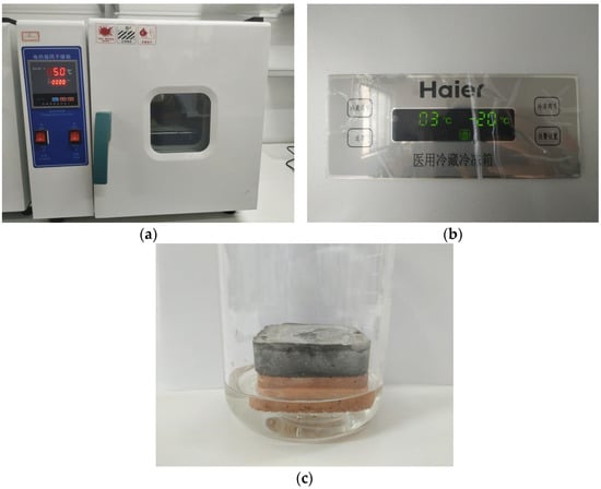 The weatherability test process of composite structure thermal bridge insulation component: (a) the drying oven with temperature set at 50 °C; (b) the refrigerator with freezing temperature of −20 °C; (c) sample immersion.