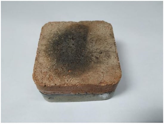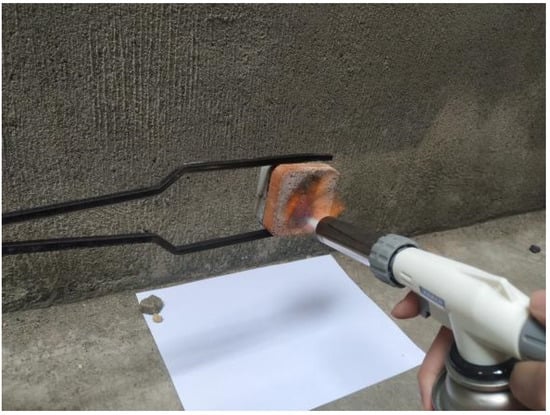 Building materials should be fire resistant; thus, the components were tested for flammability after adding the waterproof coating and adhesive coating in order to observe whether the components were flammable. The sample was fixed vertically and a piece of ignition paper was placed underneath it. The surface of the component was ignited with a flame spray gun for 15 s, 30 s, 60 s, and 90 s []. Observations were made as to whether the sample burned or emitted smoke and whether there were any burning droplets that ignited the paper. After the end of the test, the surface condition of the sample was observed.