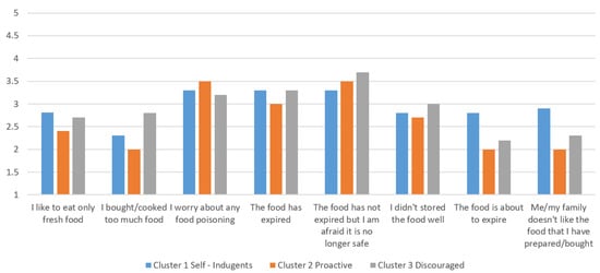 The second cluster is the largest (55% of respondents), and includes consumers with a lower level of food waste. As reported in Table 4, 40% of respondents claimed to never waste food, 25% only on special occasions, and 48% purported to waste <10% of food per week. These individuals are more likely to wish to change their wasteful behaviour. This cluster was defined as “Proactive”. These individuals show virtuous behaviour in terms of managing leftovers, declaring that they reuse them in new recipes often (33%) or always (28%) (Table 4). Fifty-eight percent of respondents never throw away leftovers, even if they are not in a sufficient quantity to permit another meal. These individuals claim to most frequently pay attention to the different information on the labels, with greater ability to interpret the expiration date compared with other two clusters (Table 6). The main reasons that lead these individuals to waste are related to food safety concerns (Figure 2).