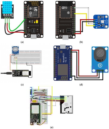 Sensors connected with ESP32. (a) DHT 11, (b) BMP180, (c) MQ 135, (d) MQ 7, (e) GP2Y1010AU0F.