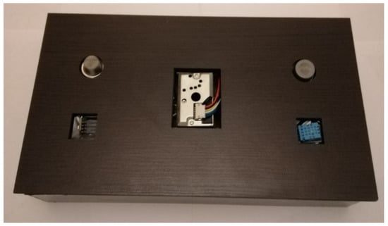 A wooden box of size 27 cm × 15 cm was designed and created to contain all of the sensors and microcontrollers to create an air-quality monitoring device, as depicted in Figure 3. An IoT box was provided with a moving mechanism at the bottom to allow the sensors, microcontrollers, and batteries to fit in easily as clearly shown in Figure 4. After the box was assembled, tests were performed to make sure that the sensors were sending readings to their specific channel on the Thingspeak platform.